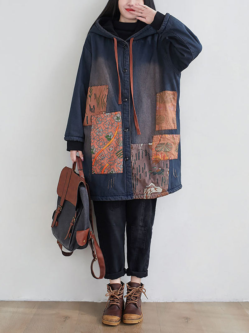 Stay warm and stylish in this full-sleeved hooded jacket. crafted from quality cotton and featuring a vintage patchwork pattern. The raglan sleeve allows for ample mobility and comfort even in colder weather conditions.