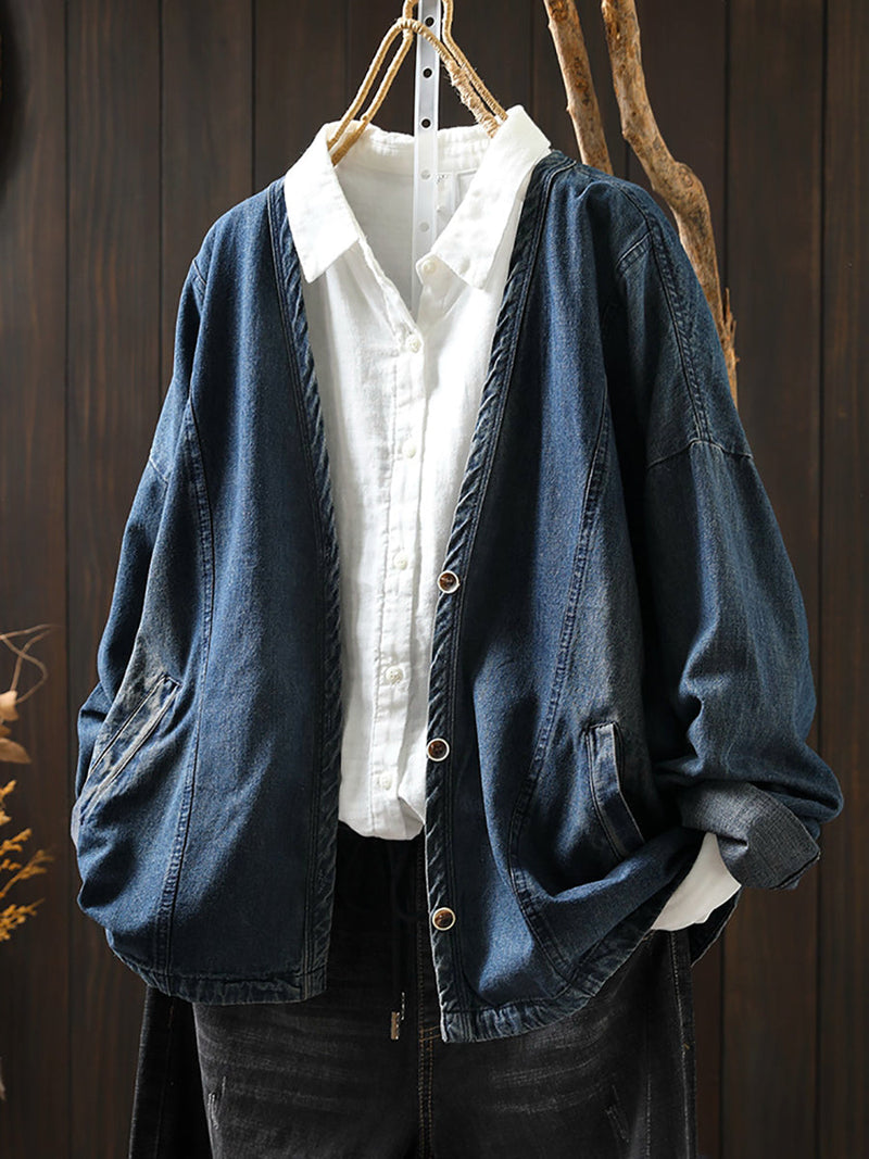 Women Vintage Spring V-Neck Denim Shirt Coat
