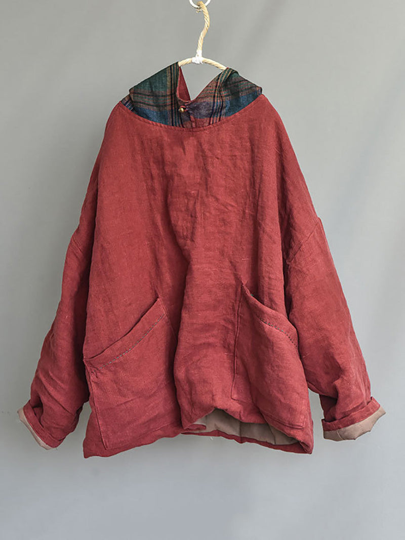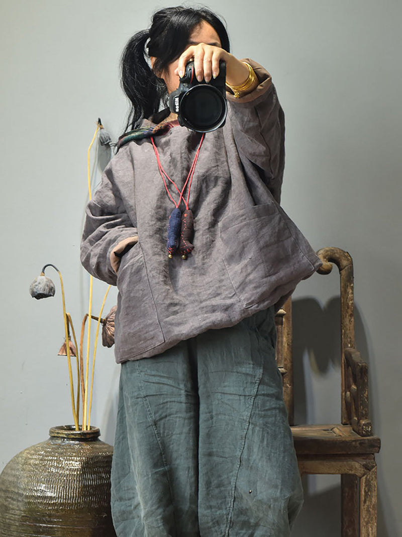 This product features a full-length raglan sleeve style and a retro design. perfect for the winter and autumn seasons. It is made from high-quality linen material and showcases a striking colorblock pattern. The hooded collar adds an extra touch of warmth and style.