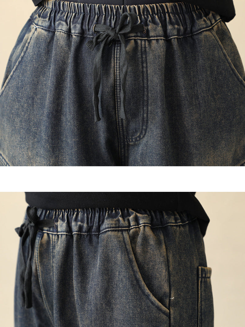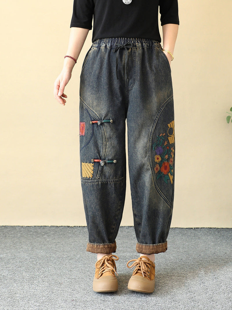 Women Winter Flower Embroidery Fleece-lined Harem Pants