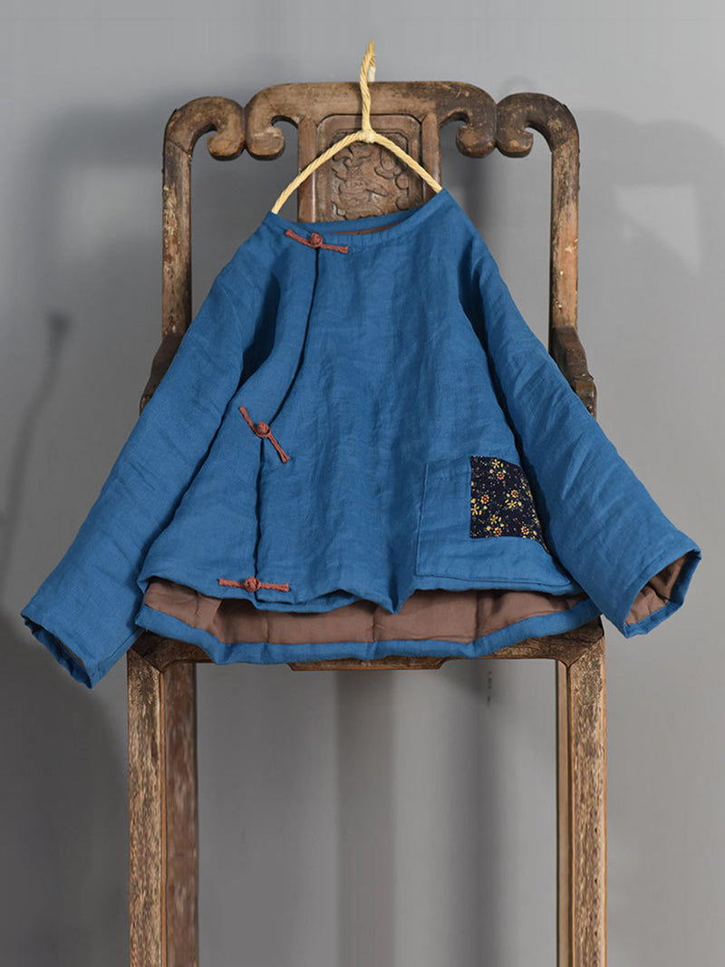 Women Winter Retro Patch O-Neck Ramie Padded Coat
