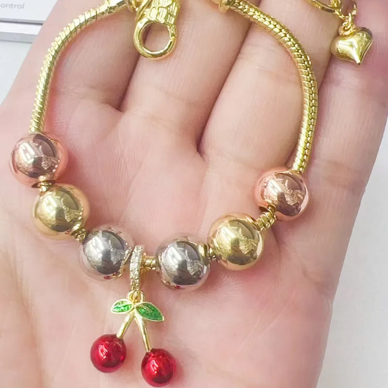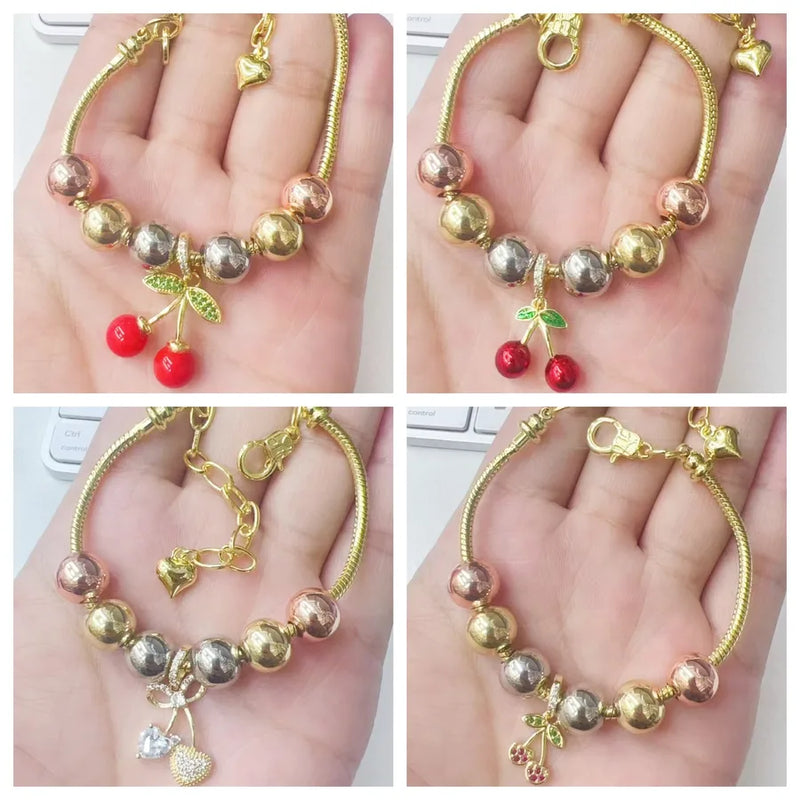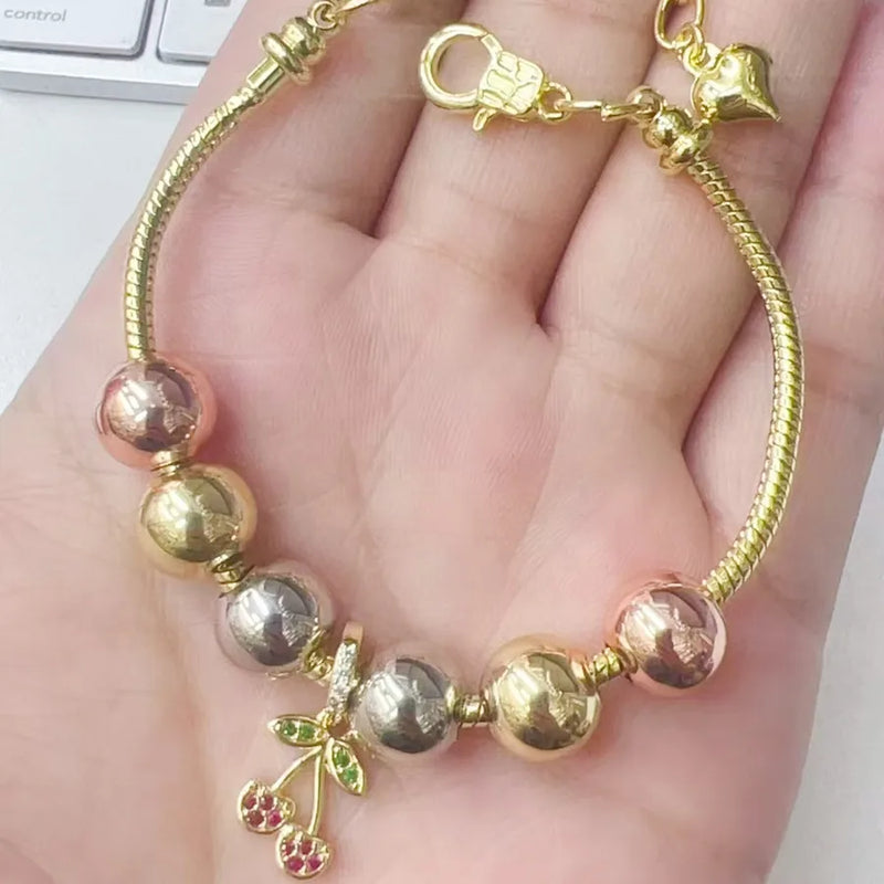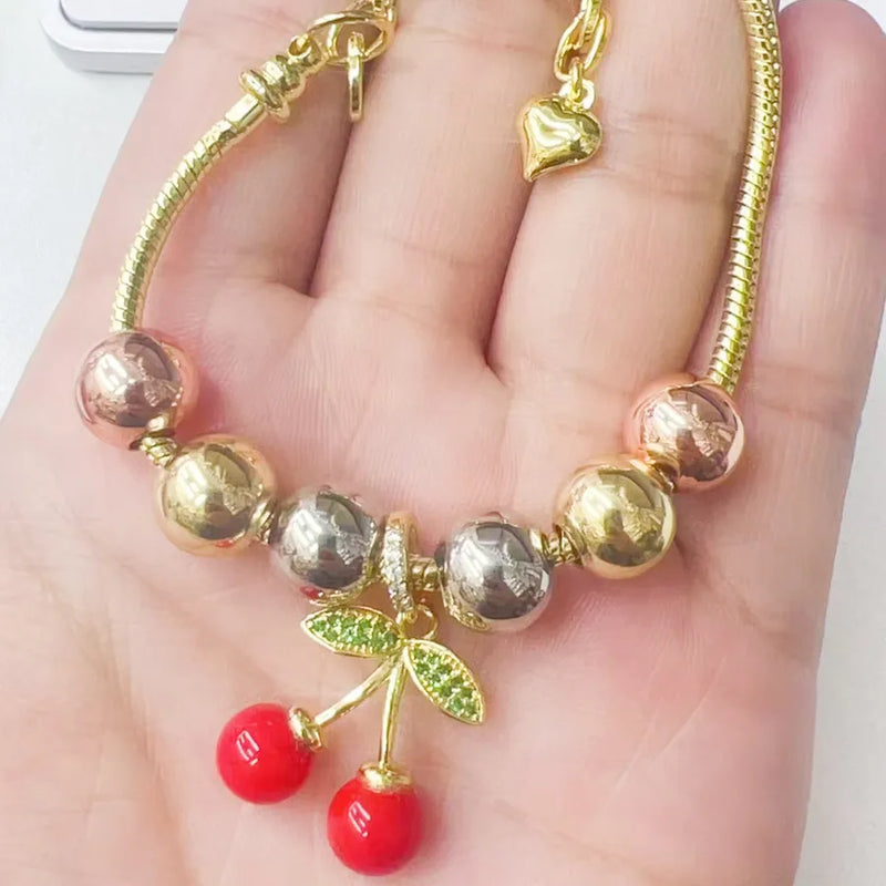 Red Cherry & Three Colors Ball Bracelet (Gold)