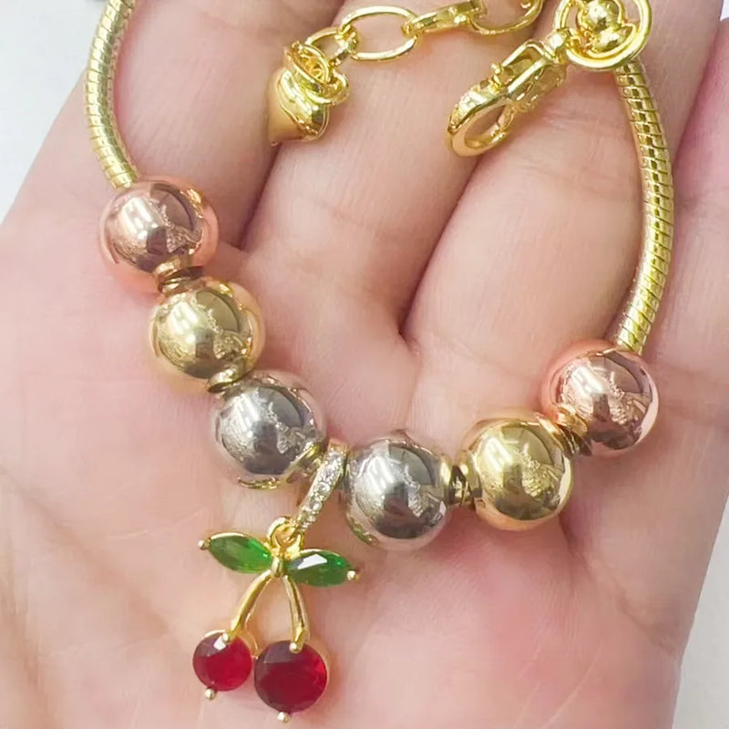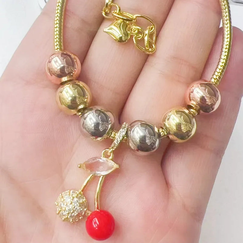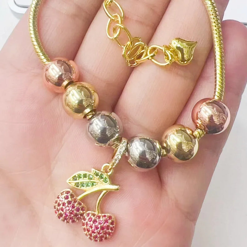 Red Cherry & Three Colors Ball Bracelet (Gold)