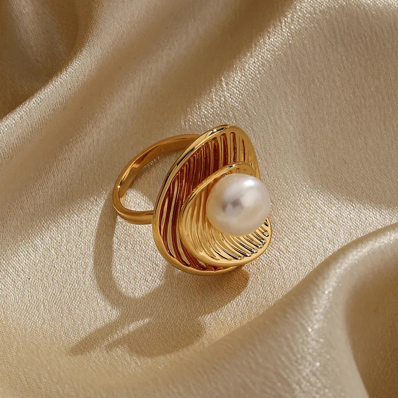 ig style solid color copper shiny metallic plating inlay freshwater pearl 18k gold plated open rings