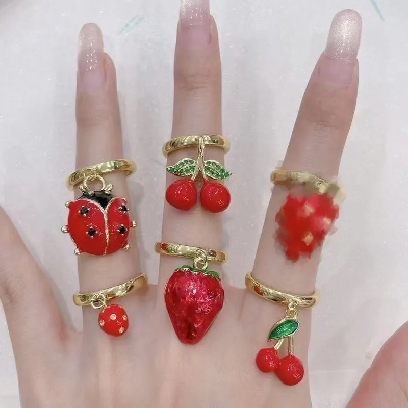 Wholesale Jewelry Casual Sweet Cherry Beetles Strawberry Copper Polishing Enamel Charm Rings