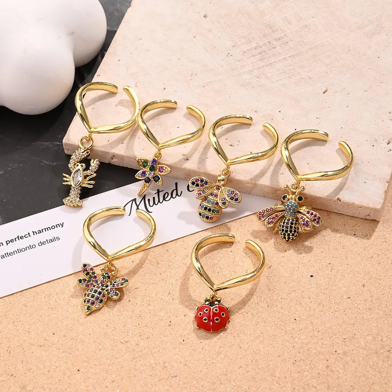 Wholesale Jewelry Vacation Modern Style Beetles Bee Dragonfly Copper Zircon 18K Gold Plated Polishing Plating Inlay Open Rings